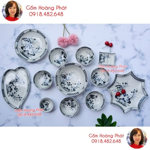 Gốm Hoàng Phát: Bộ bát đĩa cơ bản cho nhà hàng gồm bát cơm, đĩa tròn phi 16, 20, 22cm, bát tô, đĩa bầu dục, đĩa sâu lòng, bát mắm, đĩa gia vị... anh có thể đặt thêm mẫu theo yêu cầu