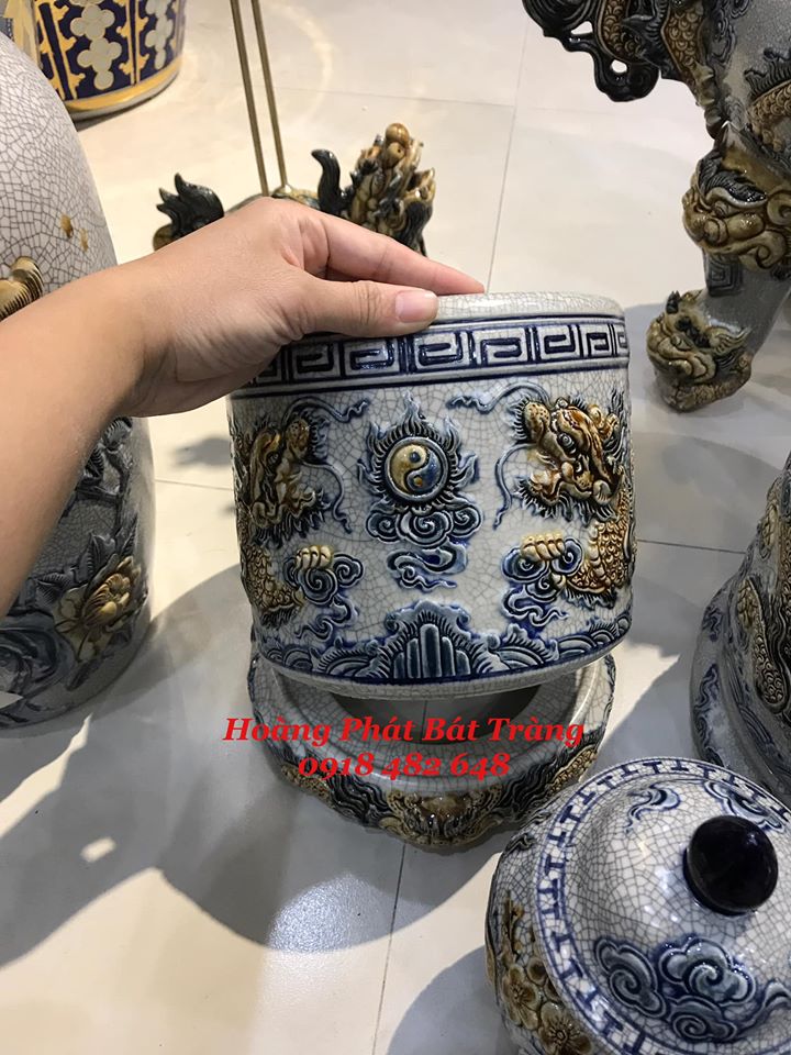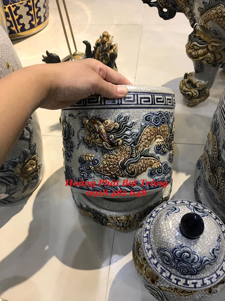 Khách ký tên bộ đồ thờ men rạn đắp nổi Bát Tràng