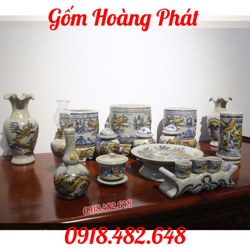 Bộ đồ thờ men rạn đắp nổi rồng cho chung cư có tủ thờ DTR005