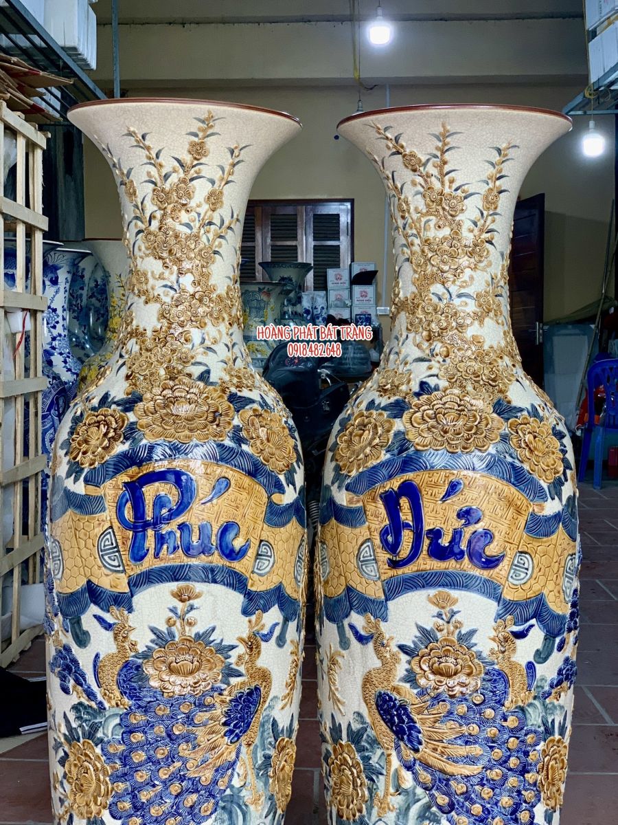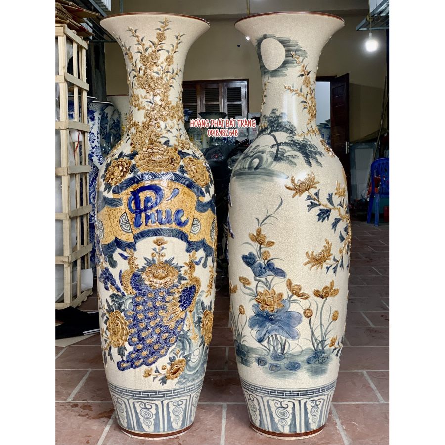 Lục bình sứ Phúc Đức công danh phú quý men rạn đắp nổi cao cấp 1m4