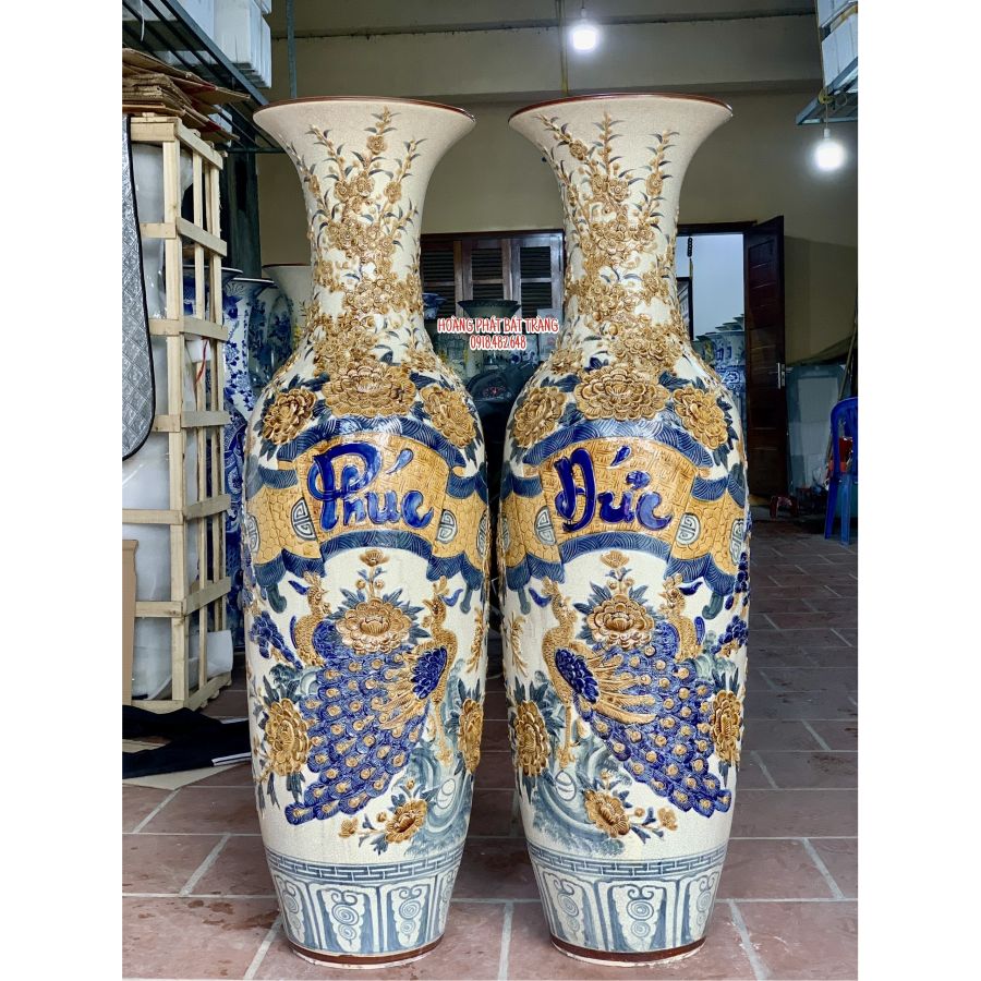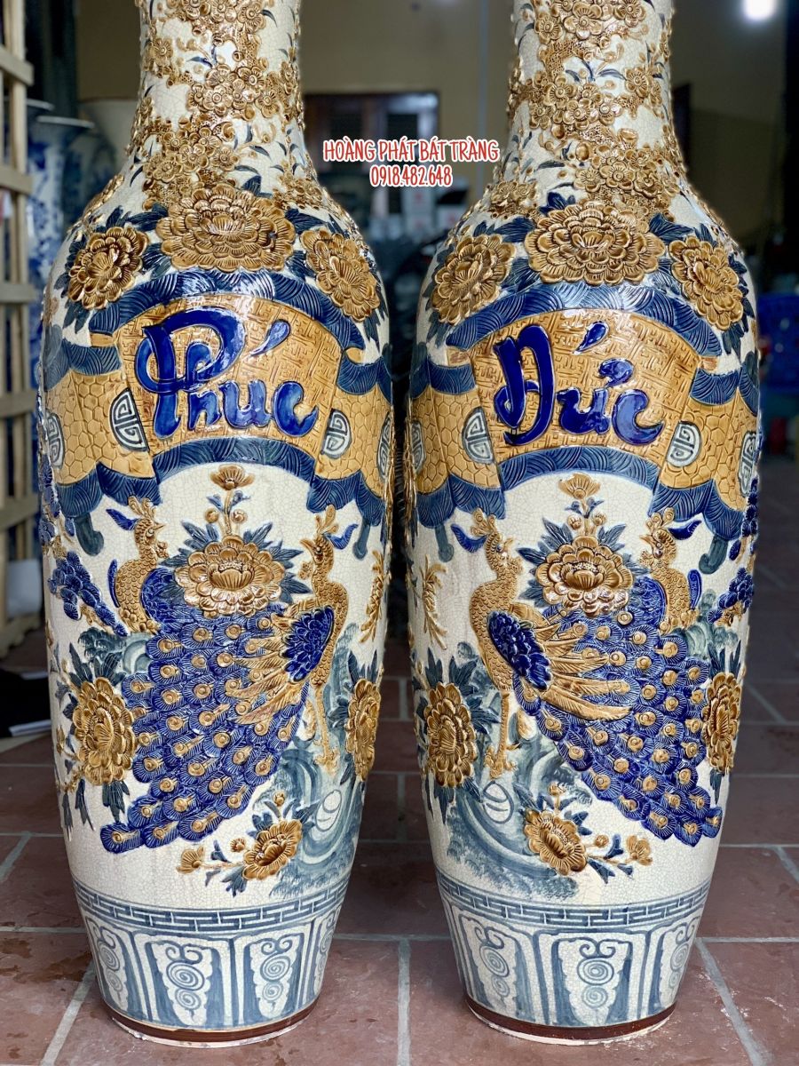 Lục bình sứ Phúc Đức công danh phú quý men rạn đắp nổi cao cấp 1m4.