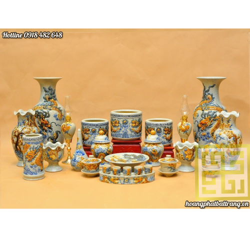 Bộ đồ thờ men rạn đắp nổi cao cấp đầy đủ ban thờ gia tiên